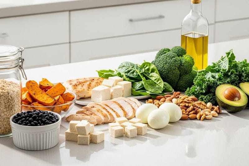 Lean proteins such as chicken, tofu, and eggs to keep you full and protect muscle mass.